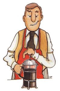 I am a great fan of the cafetiere. The container should be preheated before the brewing process begins, then spoon one generous pudding spoon of ground coffee per cup before pouring the water over it and stirring well. Do not plunge the coffee immediately: it should be left to brew for two to three minutes. To minimise the amount of sediment in the mug, let the coffee settle for a few minutes once plunged. Under no circumstances should espresso coffee be used in a cafetiere, as the coffee grains will go straight through the wire sieve filter. Once ready, the coffee may be poured into an elegant china or silver coffee-pot.