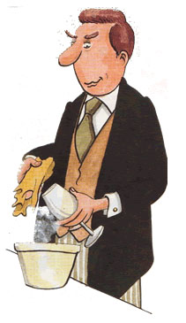 Wash glasses one at a time. Plunge the glass into the soapy water and hold it below water level. With the other hand run your fingers inside the bowl of the glass, taking care to remove gently any lipstick from the rim, or sediment lodged at the bottom. Rinse in the second bowl, leaving some water in the glass to keep it warm until it is dried. Place upright on the draining board.